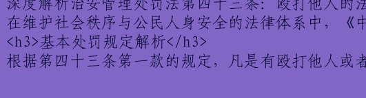 在维护社会秩序与公民人身安全的法律体系中,《中华人民共和国治安管理处罚法》扮演着至关重要的角色。其中,第四十三条作为针对暴力行为的基础性条款,明确界定了殴打他人或故意伤害他人身体行为的违法性质及相应的处罚尺度。该条款不仅是公安机关执法的重要依据,也是广大公民了解自身权利义务的关键知识点。